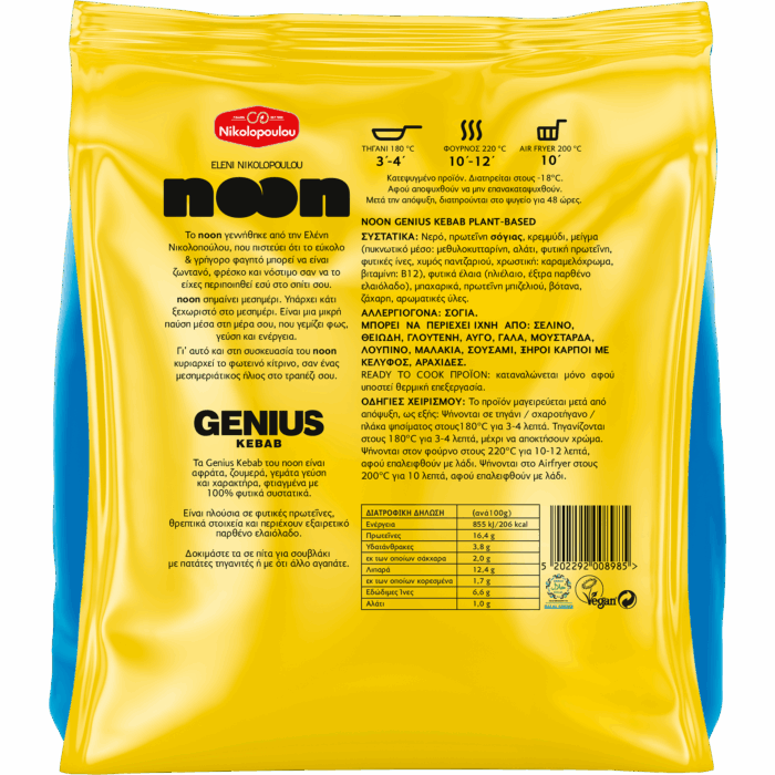 Τα Genius kebab του noon είναι τραγανά απ’ έξω, αφράτα και ζουμερά μέσα, φτιαγμένα με 100% φυτικά υλικά που είναι καλά και για εσάς και για το περιβάλλον. Είναι πλούσια σε φυτικές πρωτεΐνες, φυτικές ίνες και περιέχουν εξαιρετικό παρθένο ελαιόλαδο. Δοκιμάστε τα σε πίτα για σουβλάκι με πατάτες τηγανιτές ή με ό,τι άλλο αγαπάτε.