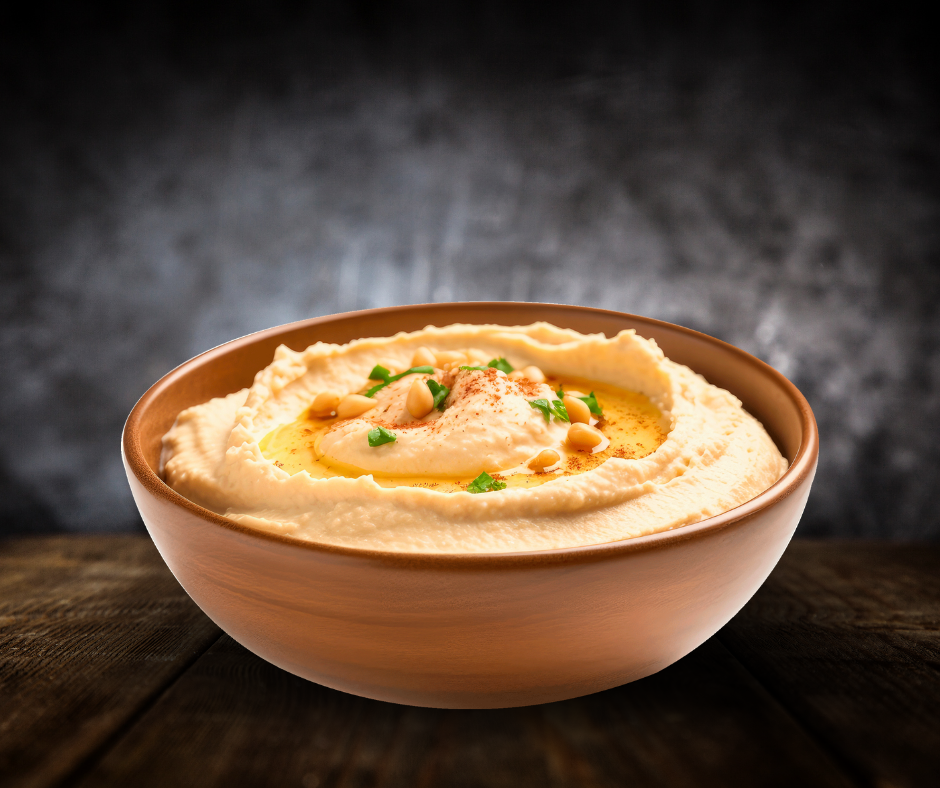 Χούμους σε πιάτο με διακόσμηση από ρεβίθια για συνοδευτικό plant-based πιάτο